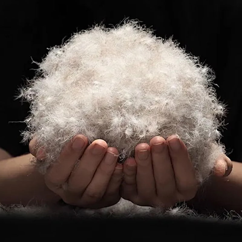Le aree centrali dell'addome e del collo delle anatre grigie che producono piumino vengono accuratamente selezionate e viene utilizzato un processo scientifico di proporzione per combinare il 50% di piumino d'anatra grigia ad alto loft e il 50% di fibre di piume di alta qualità per formare una struttura composita calda e naturale. Il piumino ha la forma di un grappolo di canne tridimensionale e la superficie di ciascun piumino è densamente ricoperta da una precisa griglia di pori triangolari per costruire un sistema di microcircolazione di controllo dinamico della temperatura: quando fa freddo, la fibra si arriccia naturalmente per formare uno strato isolante dell'aria e quando fa caldo, la fibra si allunga per favorire lo scarico dell'umidità, ottenendo una doppia regolazione intelligente di temperatura e umidità. L'esclusiva struttura a fibra cava può assorbire efficacemente il calore emesso dal corpo umano, formando al tempo stesso una barriera naturale di isolamento termico, bloccando efficacemente l'invasione di correnti fredde esterne e offrendo la giusta luce e un'esperienza calda.